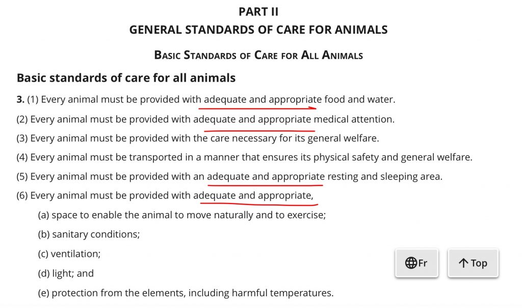 - Farm animals are still left with poor protections as farmers are allowed to “oversee themselves”. Many standard and “generally accepted” farm practices are exempt from provincial animal welfare laws, meaning that practices that would be illegal if done to a dog or cat are completely legal when done to a pig, cow, chicken, or other farmed animal. This includes causing pain and distress, and cruel confinement housing like battery cages for hens, or gestation crates for pigs—practices widely recognized as some of the most inhumane aspects of industrial farming. Letting farms make up their own rules is a giant loophole, leaving farmed animals in Canada vulnerable to many egregious practices that are “generally accepted” within industry circles. Farms are also often exempt from environmental laws like Canada’s federal price on carbon, nuisance laws, labour and employment laws, and much more.