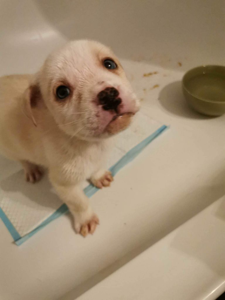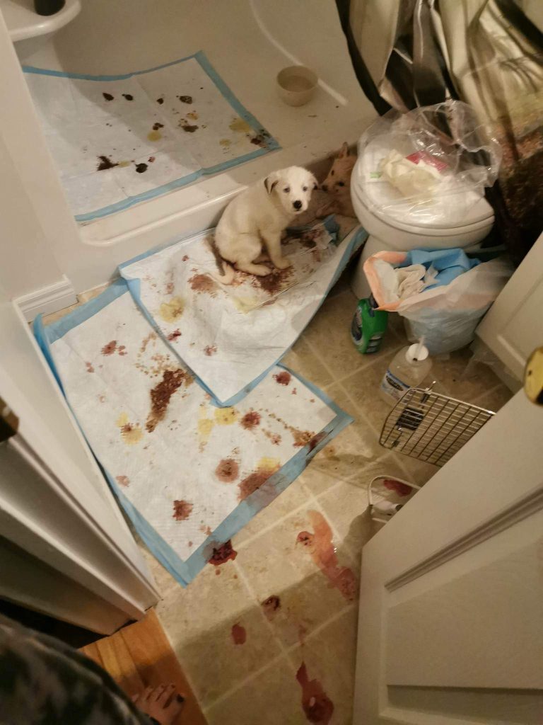 Here is JUST ONE puppy Katelyn Lidkea and Alison Casemore allowed – yes allowed to suffer. This puppy languished for days, trying to breath in the shower because Katelyn would not take him to the vet.